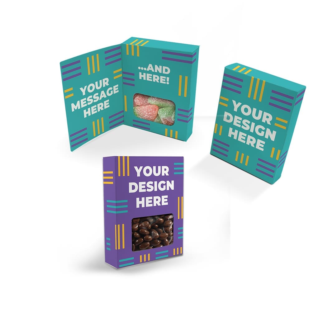 Create one-of-a-kind custom boxes filled with your choice of treats. Available with or without a front flap for added design or message space. Perfect for celebrations, thank-yous, special events, team appreciation, and more.