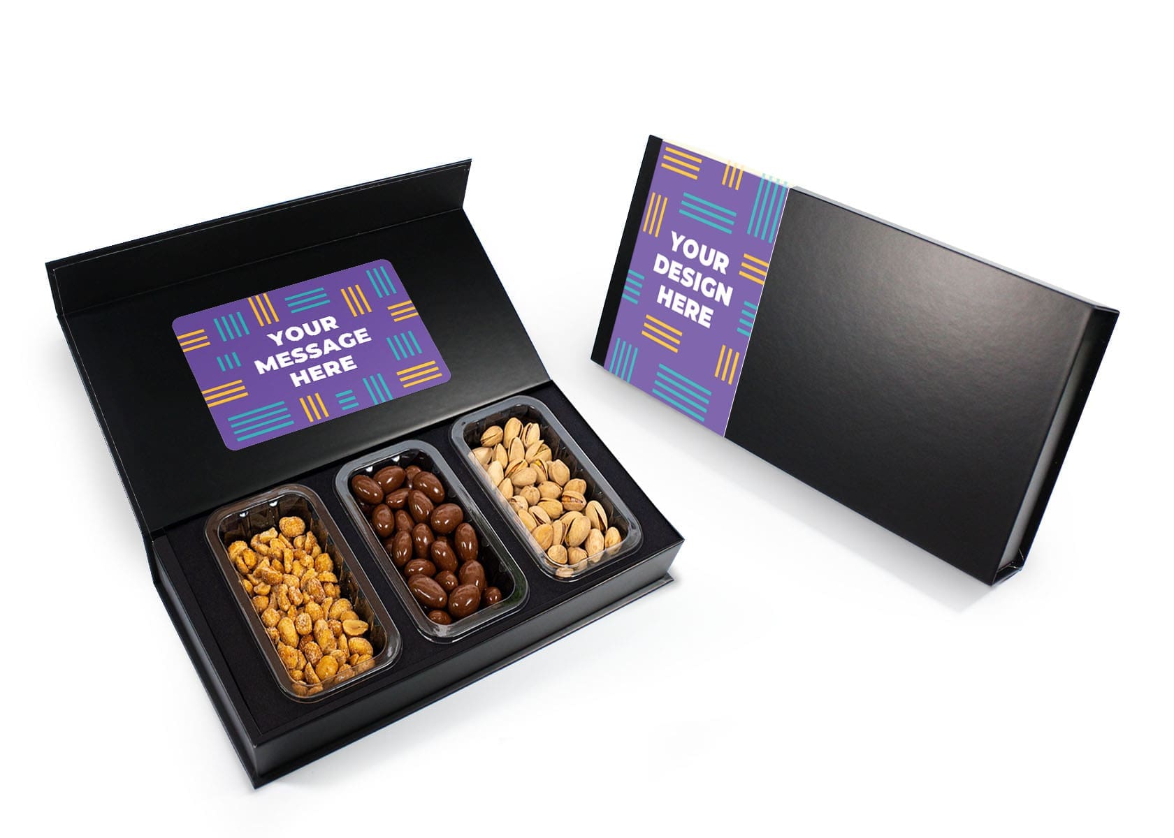 Premium taste meets thoughtful presentation. This sleek black magnetic gift box offers a refined way to share something delicious—whether for clients, colleagues, friends, or family. Wrapped with a fully customizable band and finished with a personalized note card on the inside lid, it provides plenty of space for your message, design, or logo. Polished, versatile, and undeniably gift-worthy, it’s the perfect balance of flavour, freshness, and thoughtful design.