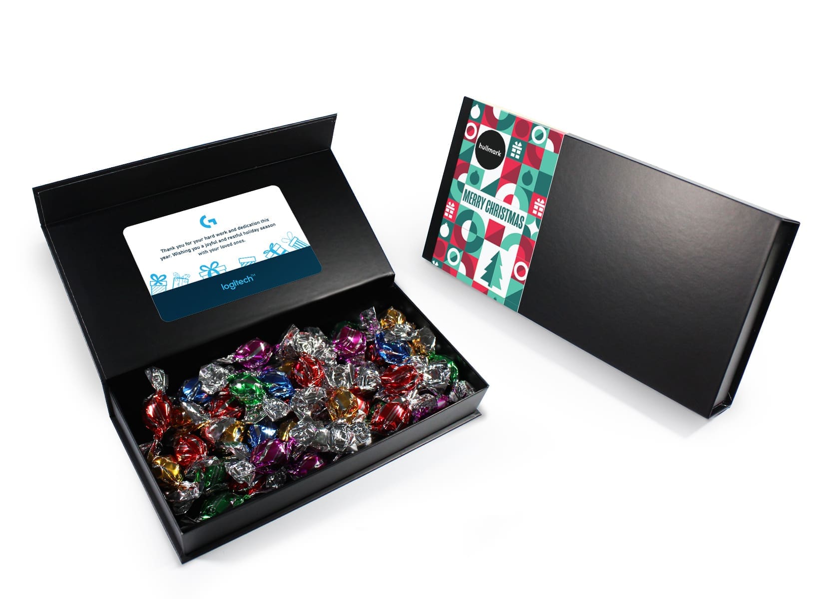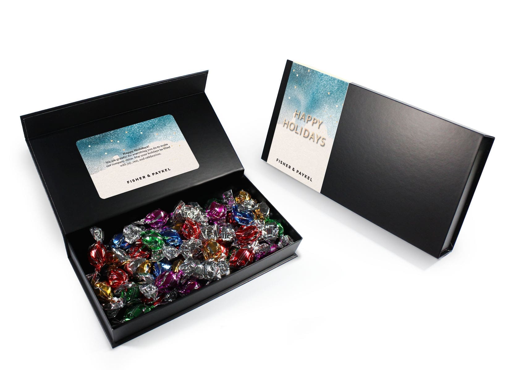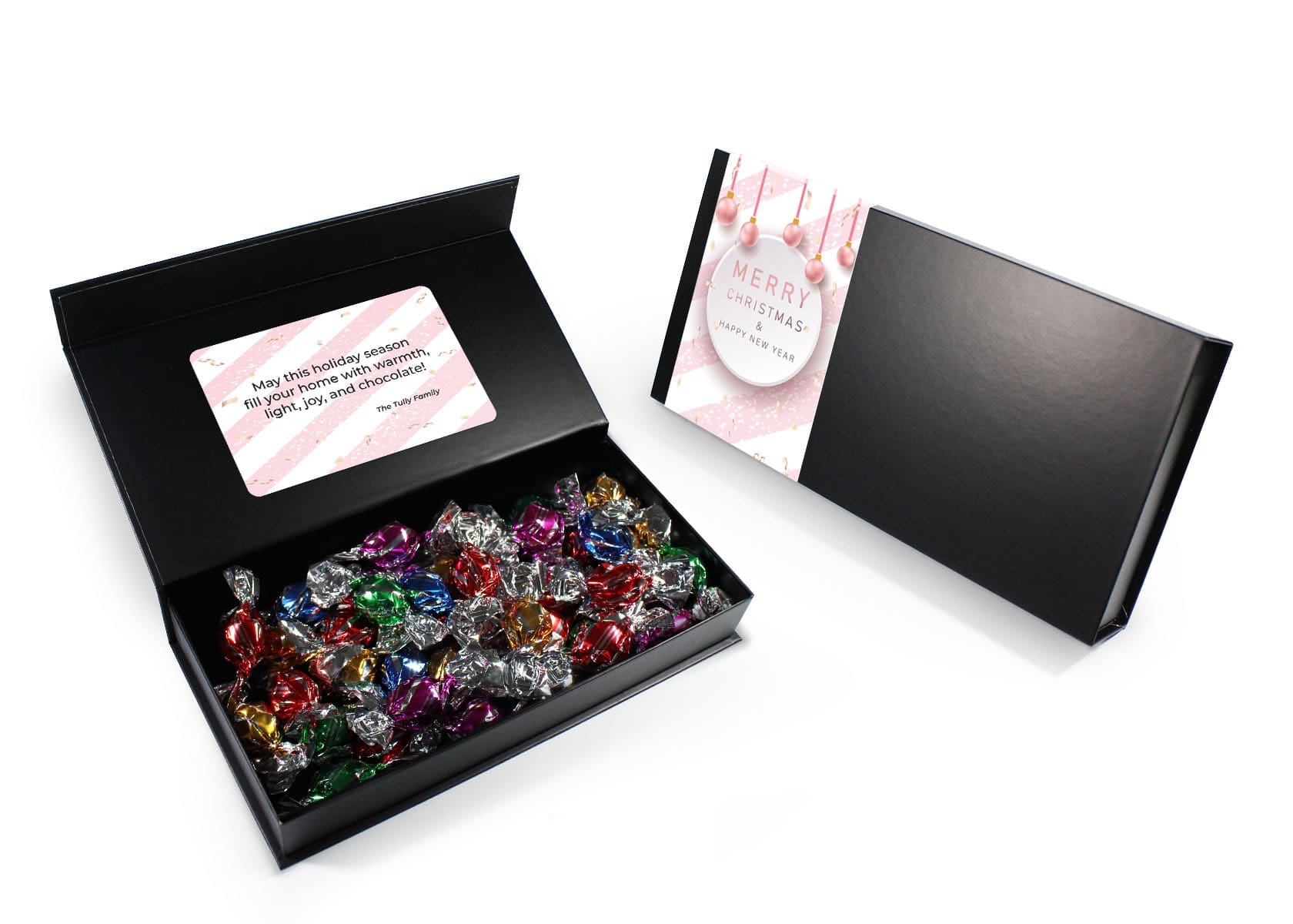 A truffle lover’s dream, beautifully boxed. Wrapped with a custom band and finished with an inside note card, this magnetic box comes filled with 45 or 80 assorted truffles — an elegant gift that’s thoughtful, generous, and impossible to resist.