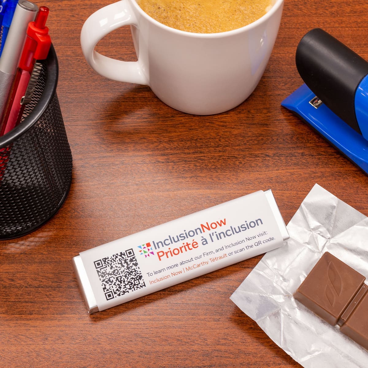 Chocolate bar filled with chocolate ganache and wrapped in a custom sleeve.
